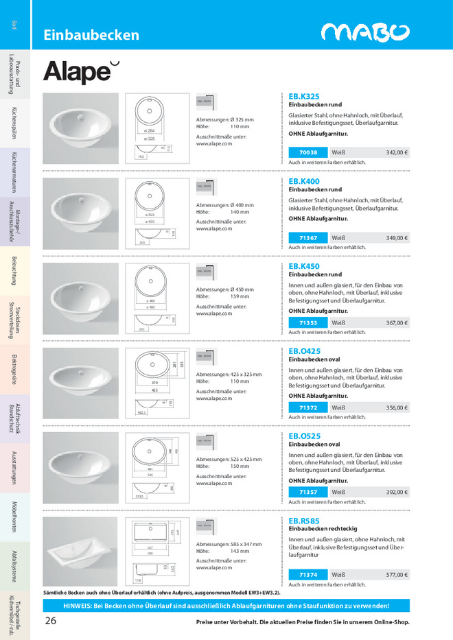 oben, ohne Hahnloch, mit Überlauf, inklusive