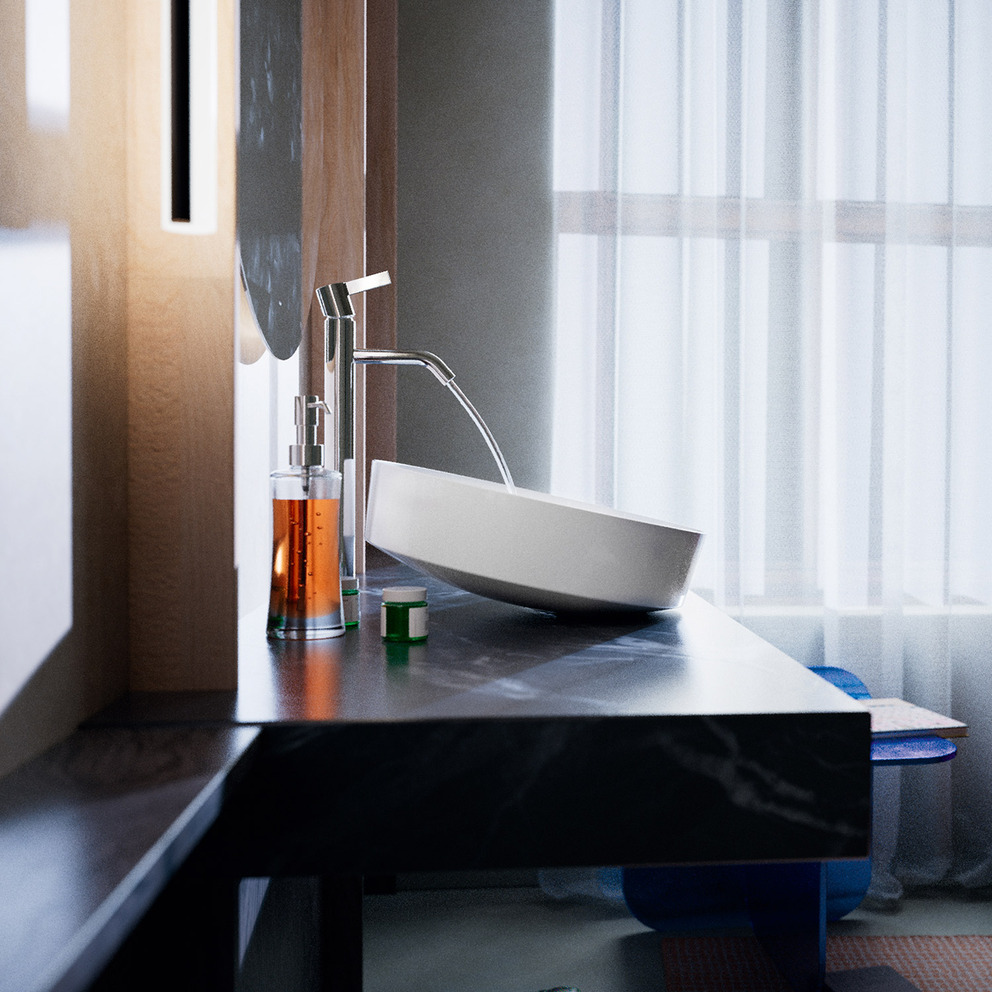 Mit seiner einzigartigen, geneigten Form scheint TENDO auf dem Waschplatz zu tanzen