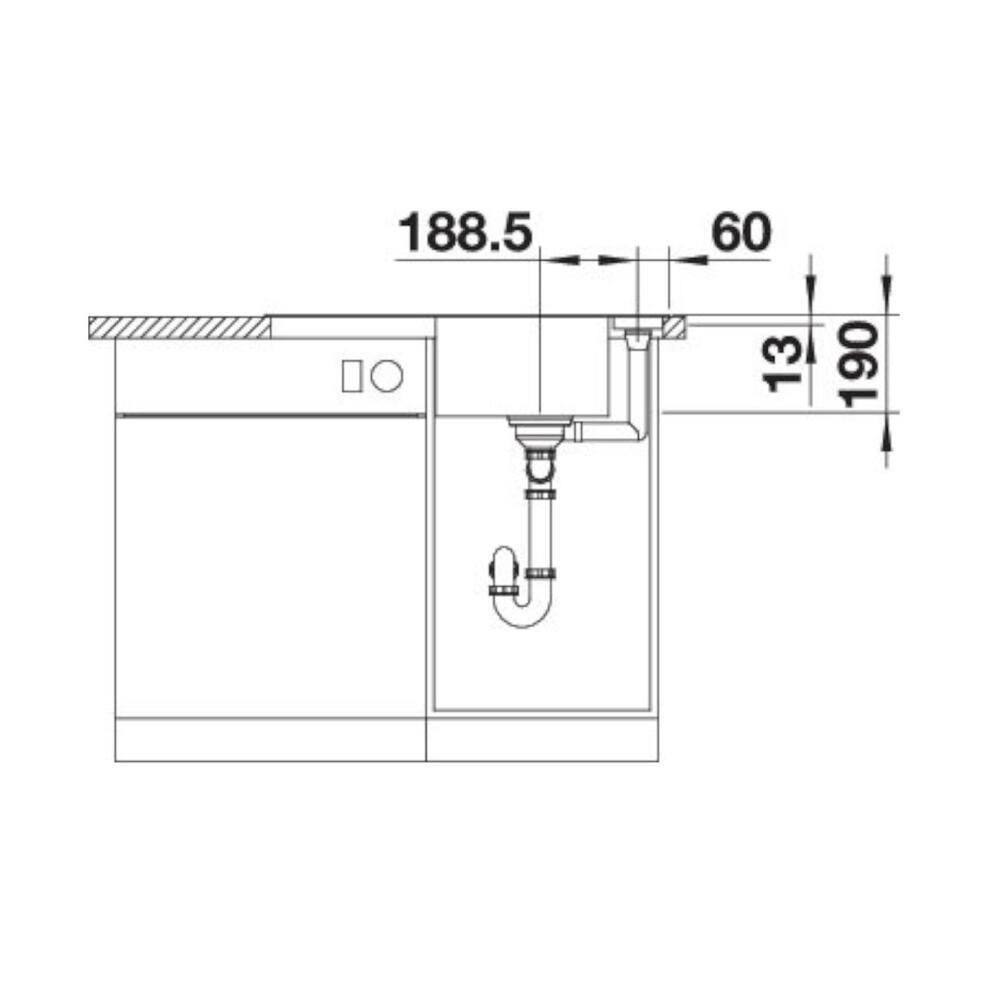 Esche-Compound-Brückenschneidbrett, Ablaufgarnitur mit Raumsparrohr, 3 ½‘‘ InFino-Korbventil mit integrierter Ablauffernbedienung (Drehknopf).