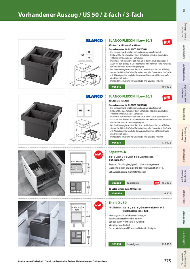 Bei der Planung beachten Sie bitte die Einbauhöhe des Abfallsy- stems, die Höhe des Schubladenbodens, die Einbautiefe der Spüle mit Ablaufgarnitur und die daraus resultierenden Mindestmaße des Unterschranks