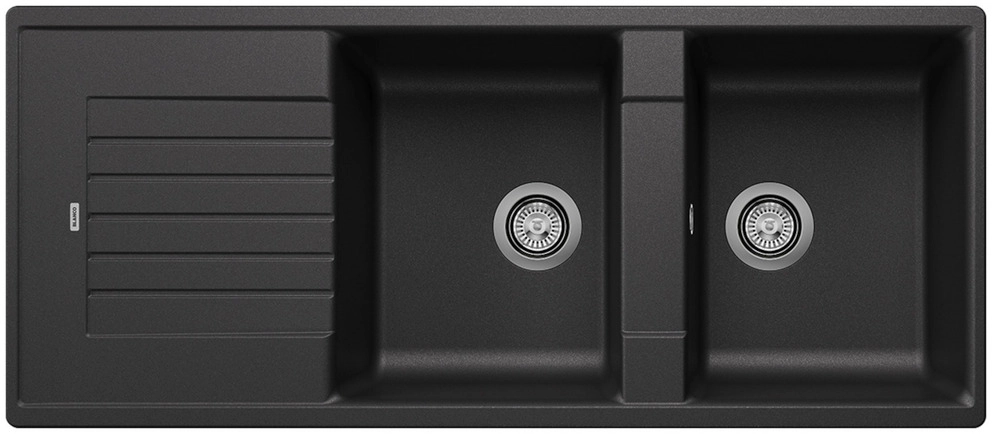 Modernes Design mit klarer Linienführung. Geradlinige Außenkontur, betont durch schmalen Rand. Charakteristische Batteriebank, die als Rahmen die Abtropffläche vergrößert. Große Doppelbeckenspüle plus Abtropffläche bietet viel Platzkomfort. Klassische Beckenanordnung zum reversiblen Einbau.