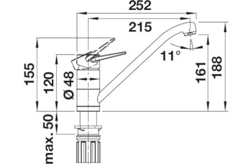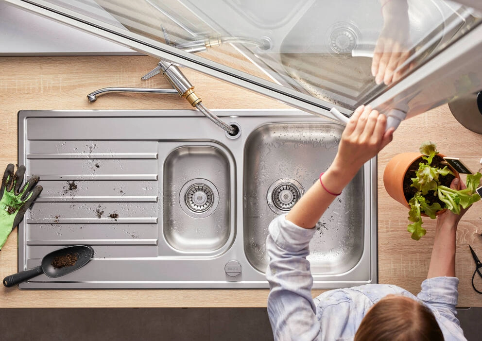 Für die Montage vor dem Fenster. Kopfhebelarmatur für flexible Planung und leichte Bedienung. Besonders geeignet für kompakte Spülen und Becken. Mindestabstandzwischen Spüle und Fensterflügel 2,5 cm.