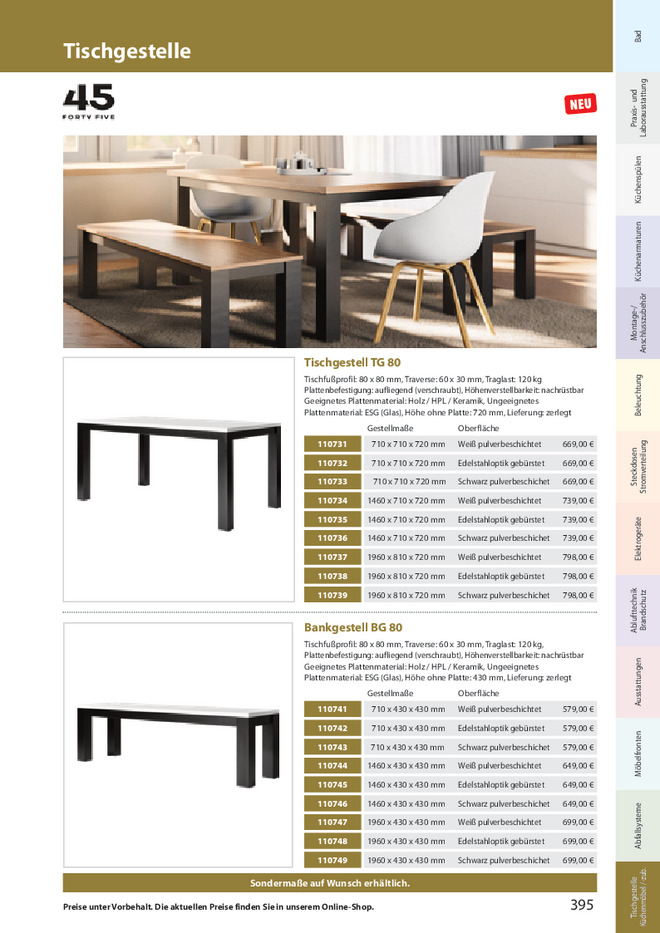 Tischfußprofil: 80 x 80 mm, Traverse: 60 x 30 mm, Traglast: 120 kg,