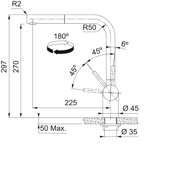 • Dank des 0-90° Bediengriffes ist eine wandnahe Montage möglich