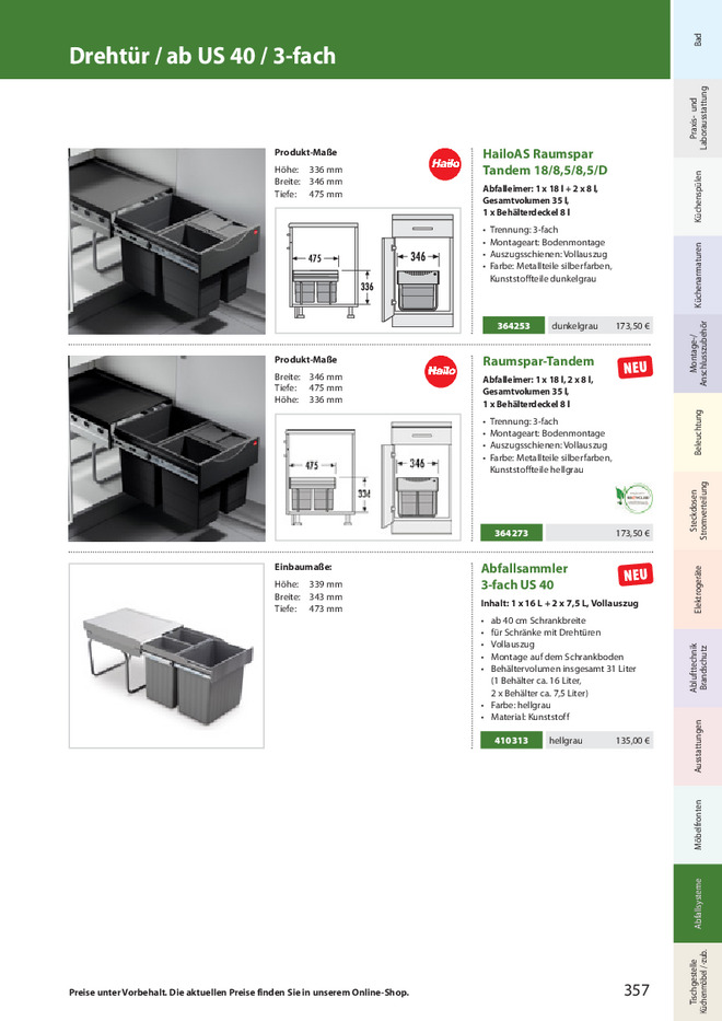 Raumspar-Tandem Abfalleimer: 1 x 18 l, 2 x 8 l,