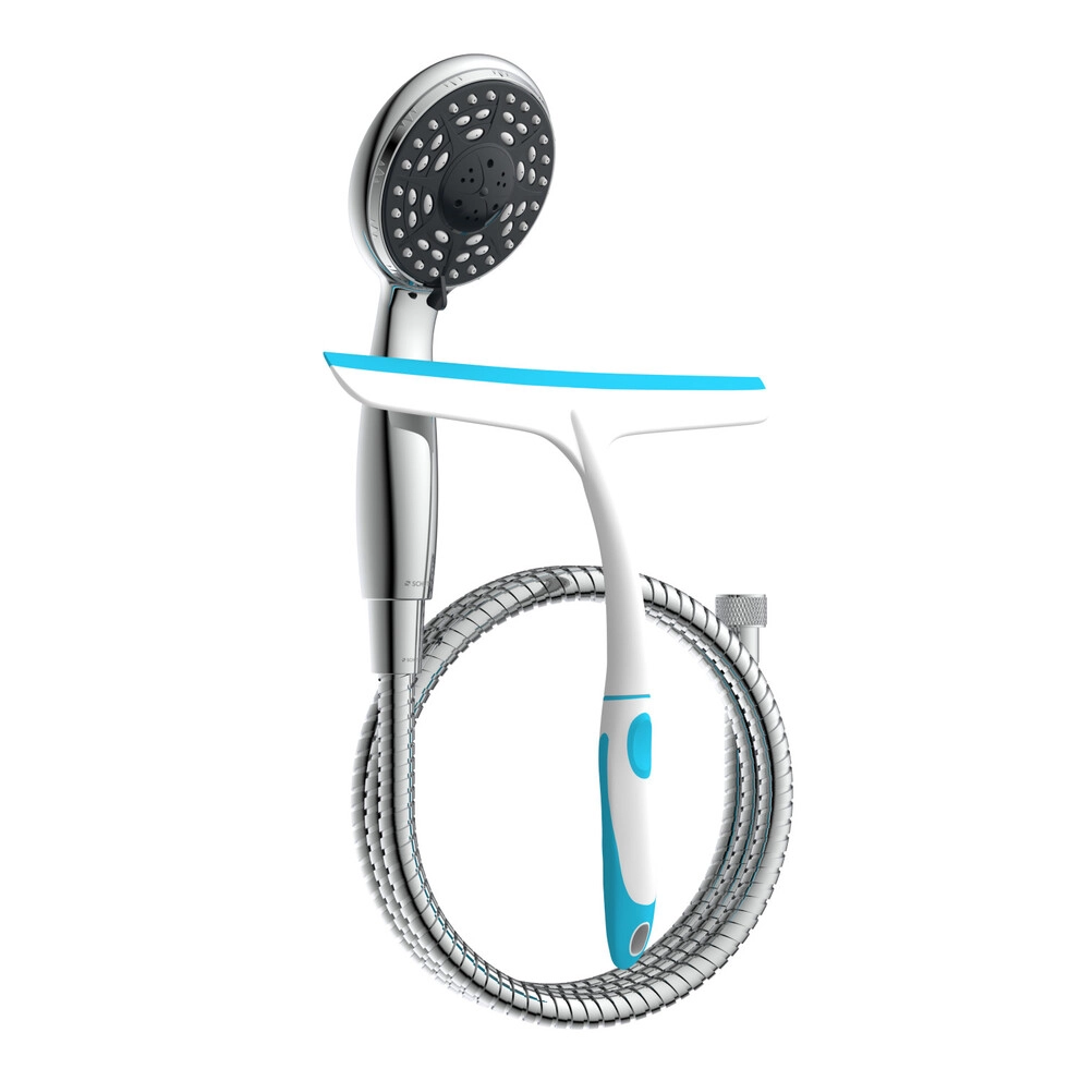 Duschbrause mit Schlauch und praktischem Duschabzieher. Dank der Breite von ca. 25 cm lassen sich Glasflächen und Fliesen schnell und einfach von Wasserrückständen befreien.