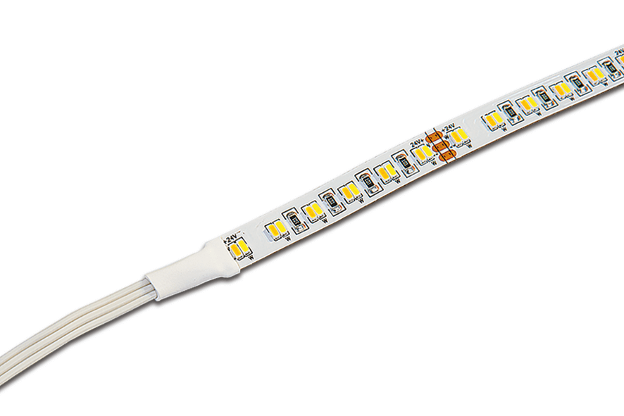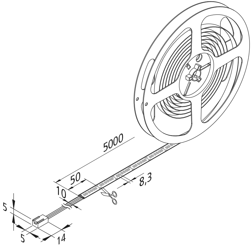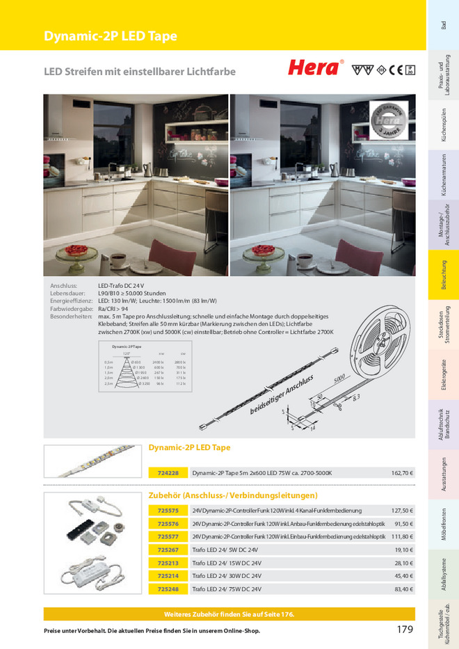 Streifen alle 50 mm kürzbar (Markierung zwischen den LEDs); Lichtfarbe zwischen 2700K (xw) und 5000K (cw) einstellbar;