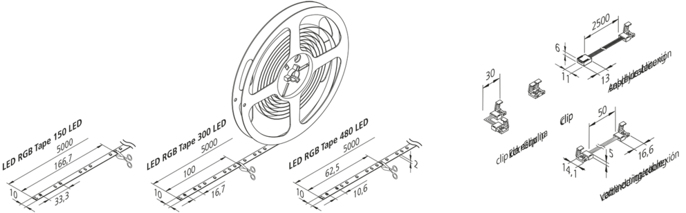 Besonderheiten: max. 5 / 10 m (Version 300 / 150 LED)