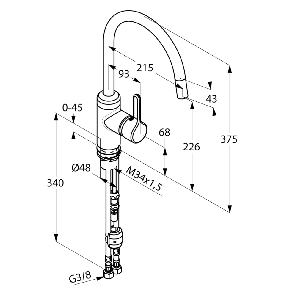 schwenkbarer Auslauf 230°, flexible Anschlüsse,