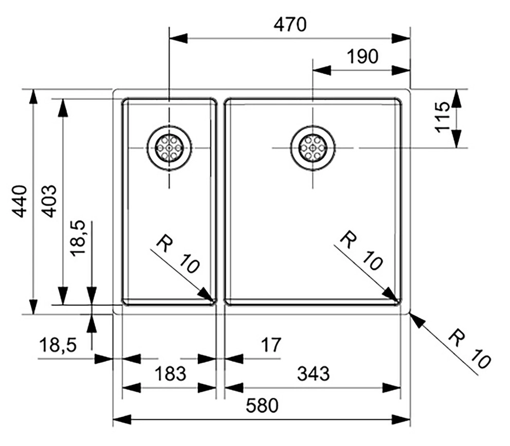 Spülengröße: 183 x 403 + 343 x 403 mm