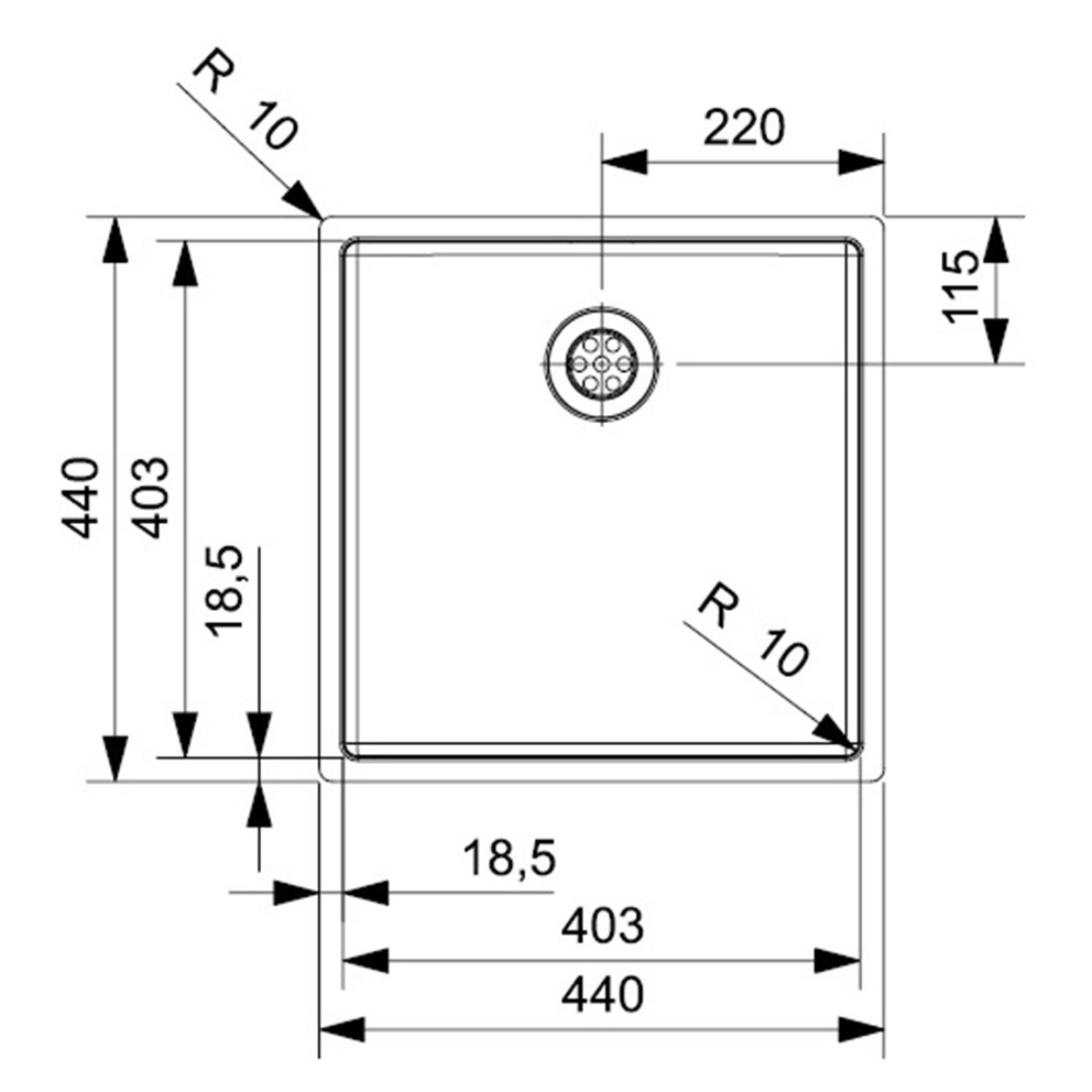 Tiefe: 180 mmSpülengröße: 403 x 403 mmGesamtgröße: 440 x 440 mm