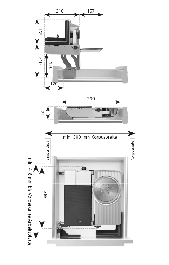 Abstand Schubkastenboden bis Arbeitsplattenoberkante: min. 165 mm, max. 210 mm