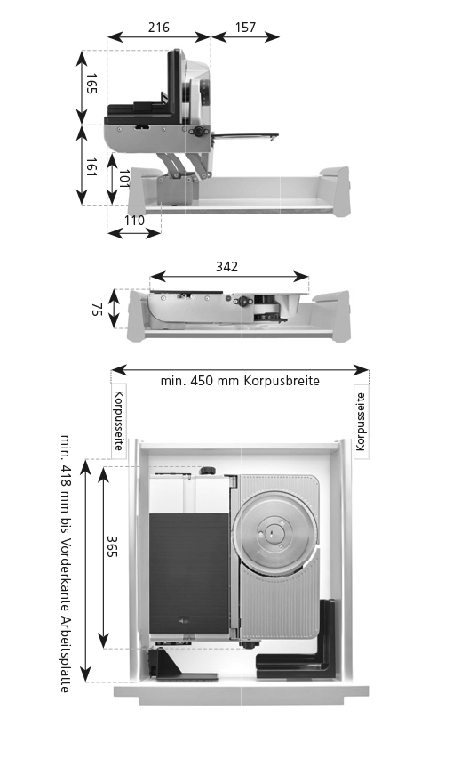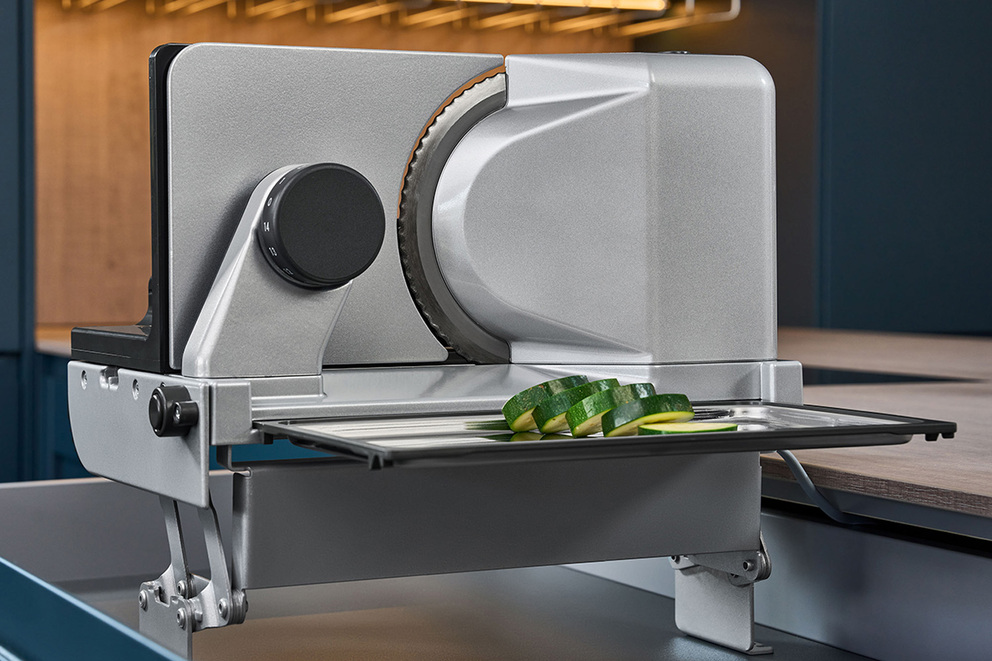Die am häufigsten eingebaute Schneidemaschine AES 62 braucht nur wenig Platz und ist mit einem Handgriff aufgeklappt und funktionsbereit im Schubkasten.