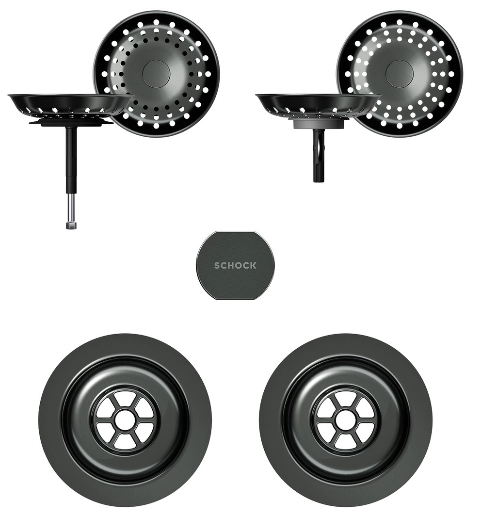 Sichtteile bestehend aus Drehgriff für Exzenterbetätigung, Siebkorb, Schmutzsieb und Überlaufblende passend zum Spülenmodell.
