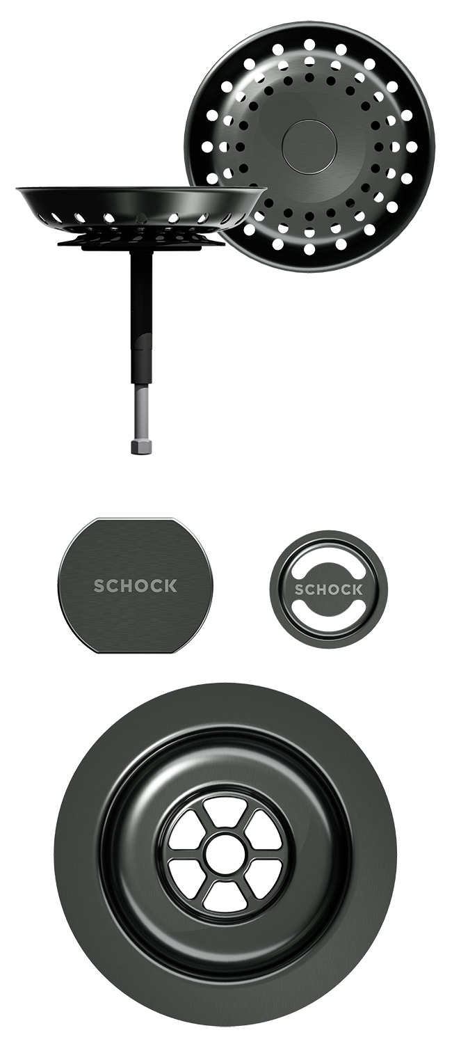 Sichtteile bestehend aus Drehgriff für Exzenterbetätigung, Siebkorb, Schmutzsieb und Überlaufblende passend zum Spülenmodell.