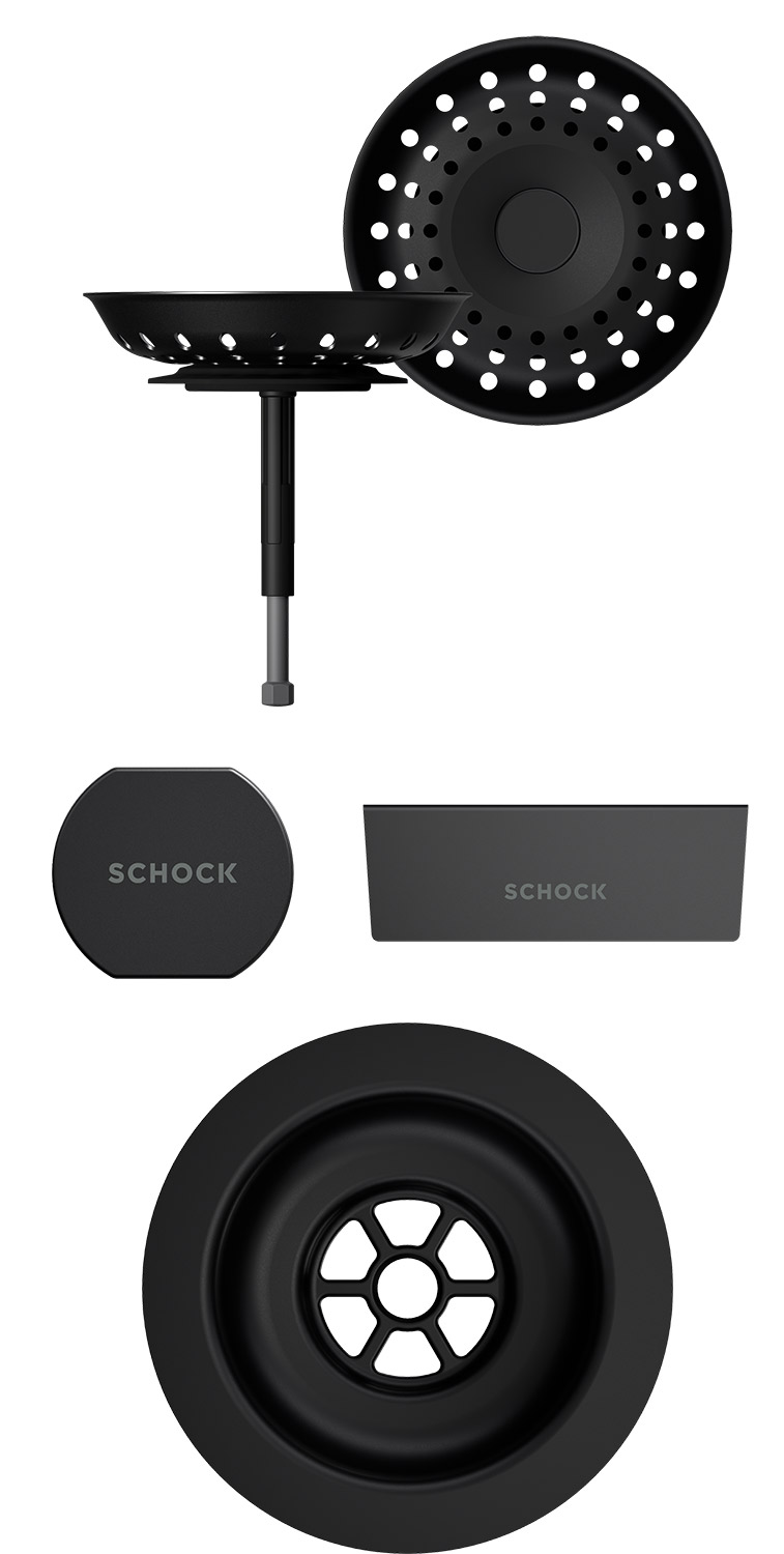 Sichtteile bestehend aus Drehgriff für Exzenterbetätigung, Siebkorb, Schmutzsieb und Überlaufblende passend zum Spülenmodell.