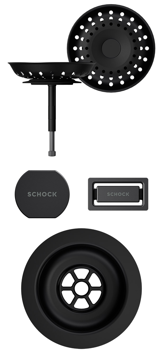 Sichtteile bestehend aus Drehgriff für Exzenterbetätigung, Siebkorb, Schmutzsieb und Überlaufblende passend zum Spülenmodell.