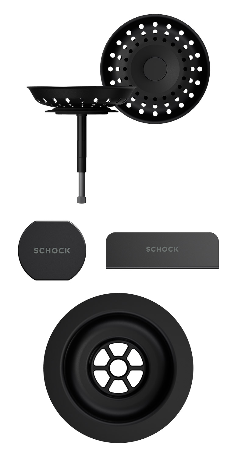 Sichtteile bestehend aus Drehgriff für Exzenterbetätigung, Siebkorb, Schmutzsieb und Überlaufblende passend zum Spülenmodell.