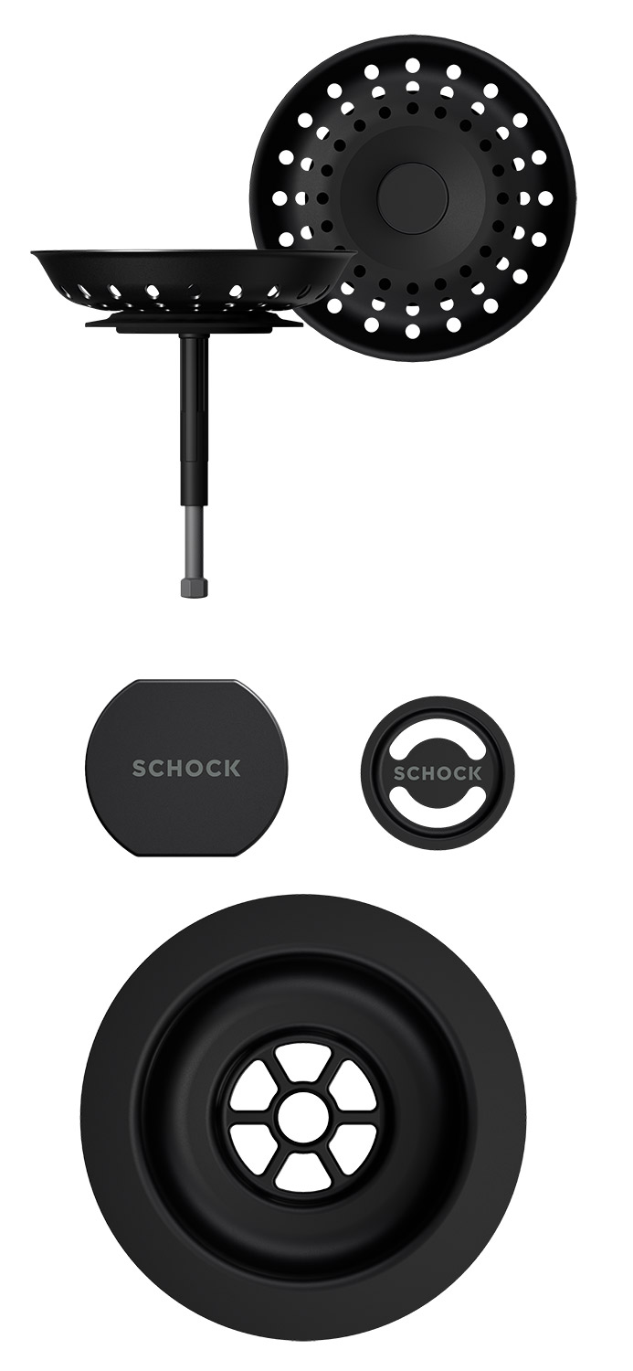 Sichtteile bestehend aus Drehgriff für Exzenterbetätigung, Siebkorb, Schmutzsieb und Überlaufblende passend zum Spülenmodell.