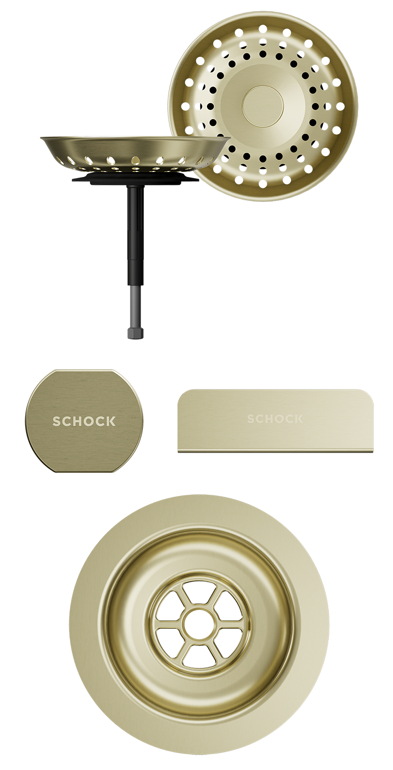 Sichtteile bestehend aus Drehgriff für Exzenterbetätigung, Siebkorb, Schmutzsieb und Überlaufblende passend zum Spülenmodell.