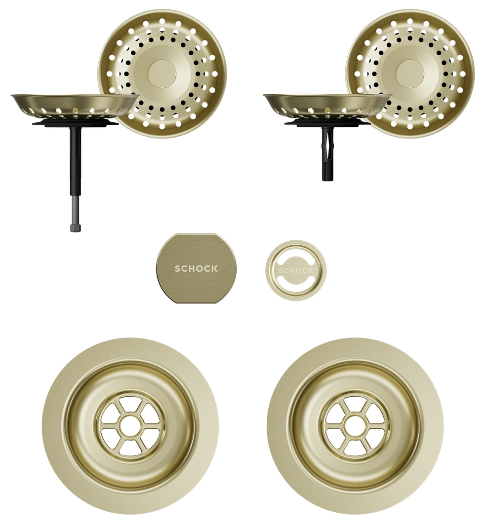 Sichtteile bestehend aus Drehgriff für Exzenterbetätigung, Siebkorb, Schmutzsieb und Überlaufblende passend zum Spülenmodell.