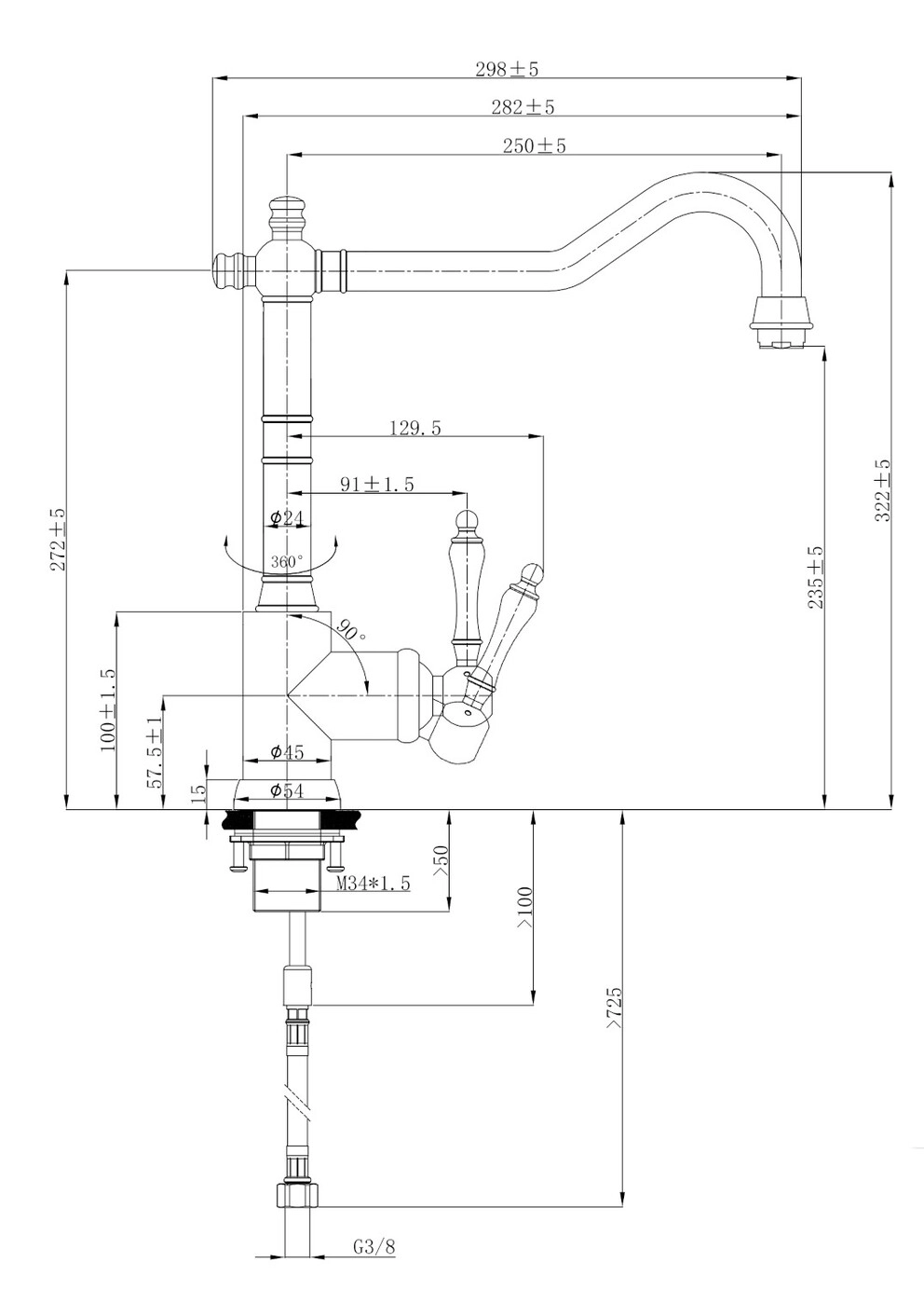 -Montage der Armatur direkt vor einer Wand möglich, da die Kalt- und Warmwasserregulierung um 90° in Richtung Küchenspüle erfolgt