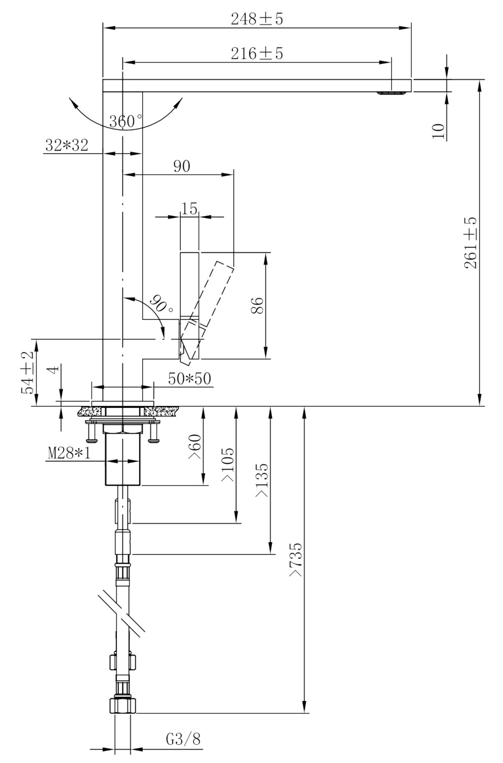 -Installationsabstand zur Wand beachten, da die Kalt- und Warmwasserregulierung jeweils um 45°