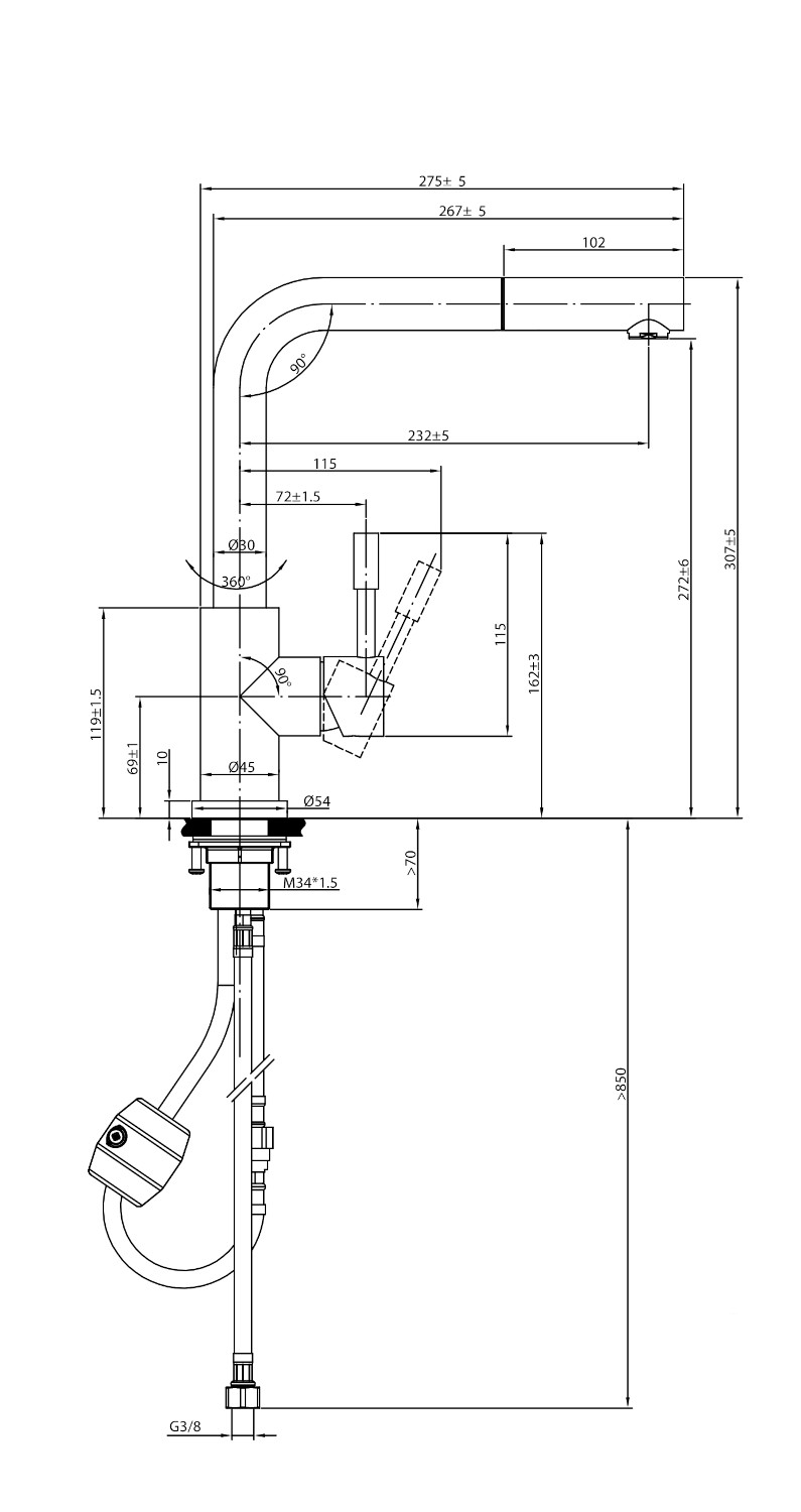 -Sockelhöhe bei ausgezogener Armatur: 54mm