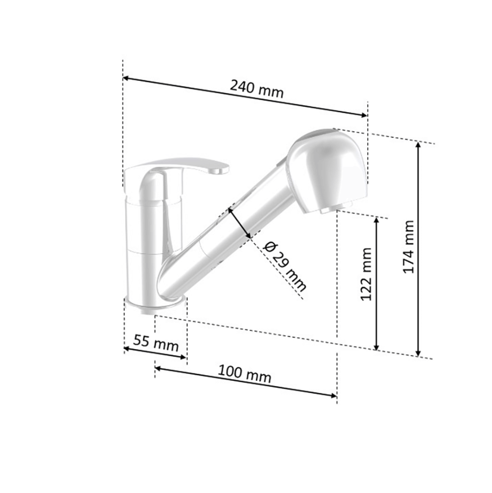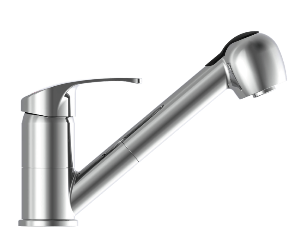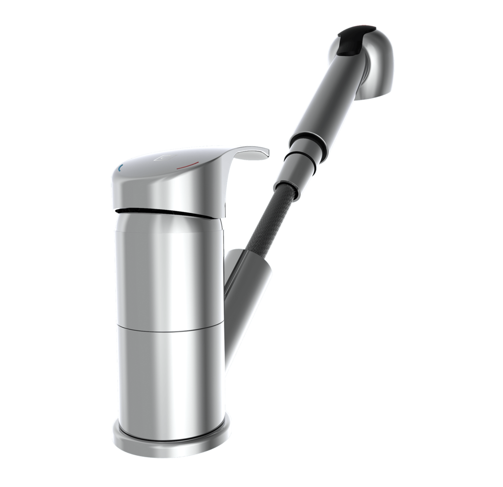 Ausgerüstet mit einem 140 cm langem Gewebeschlauch und einer Geschirrbrause,